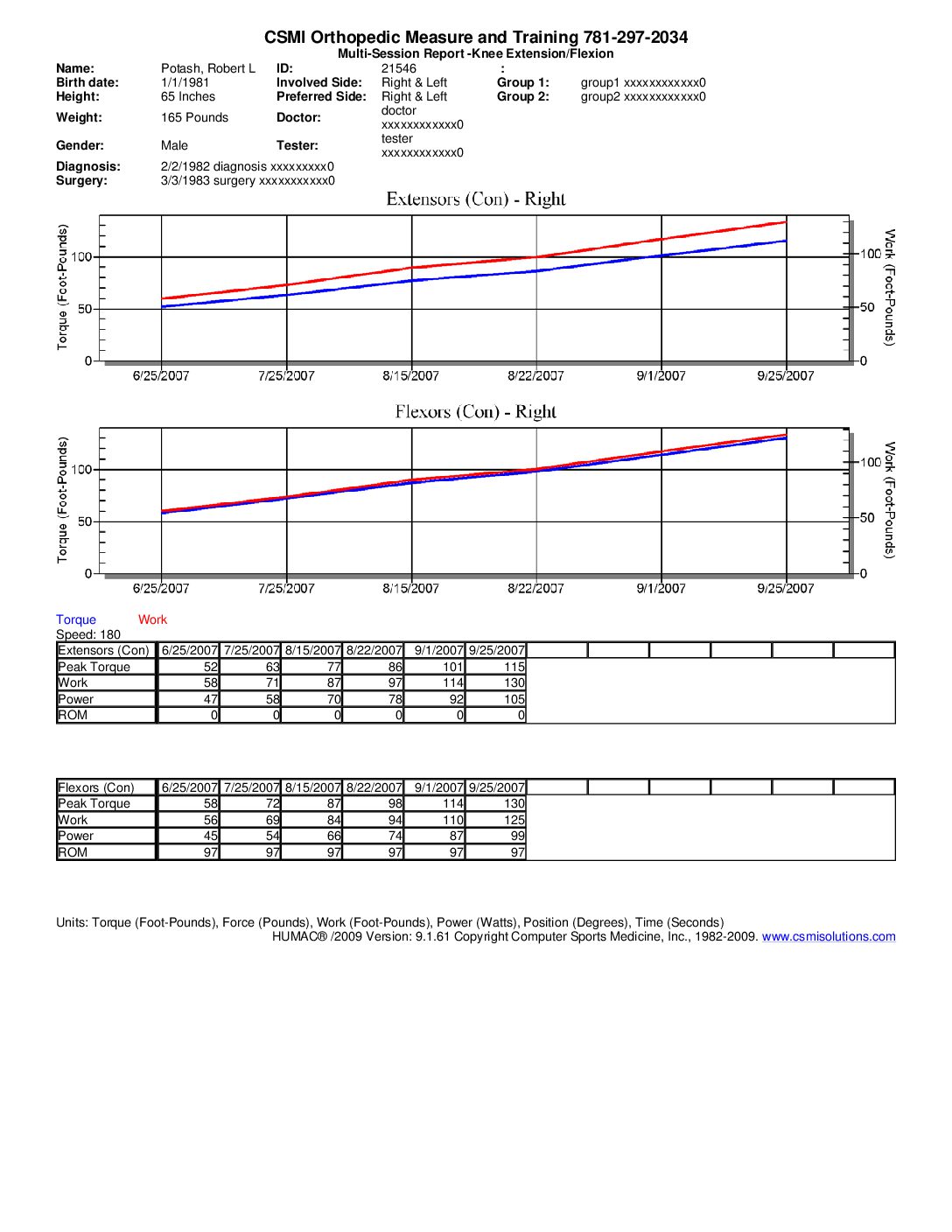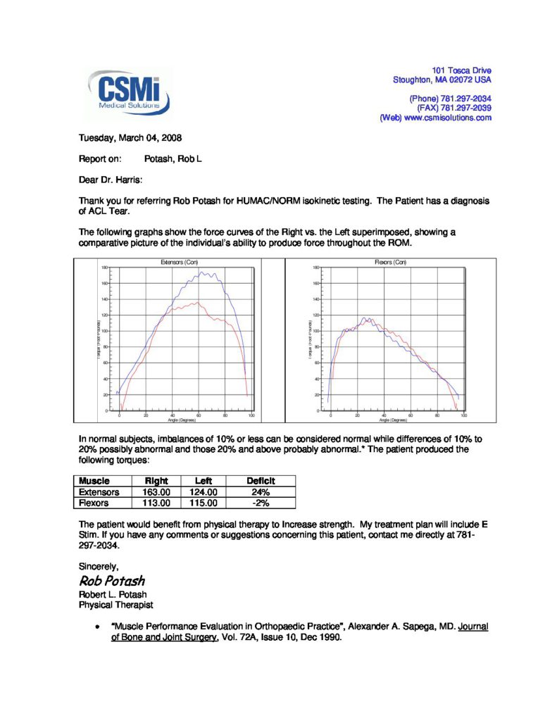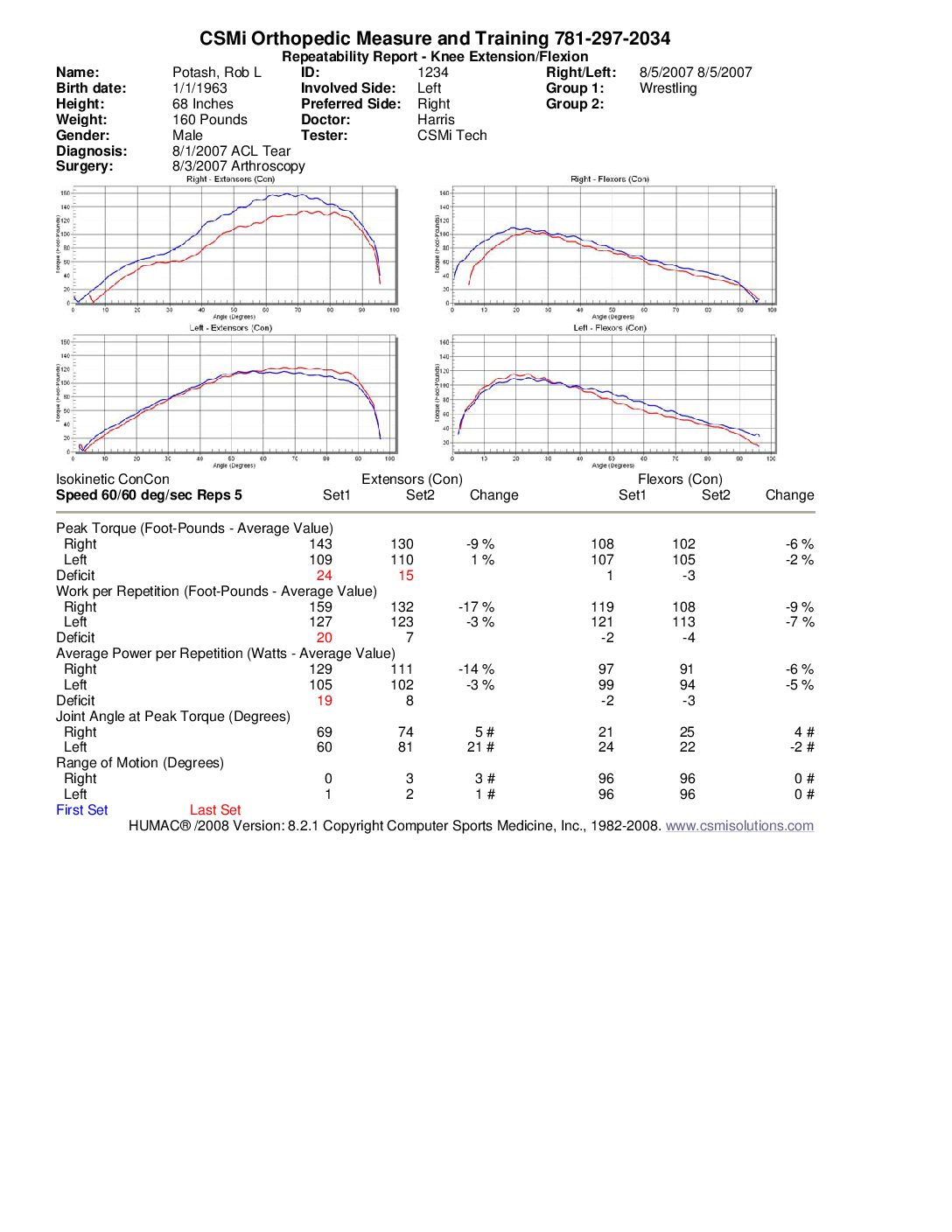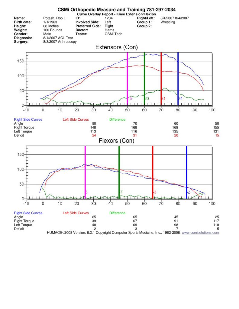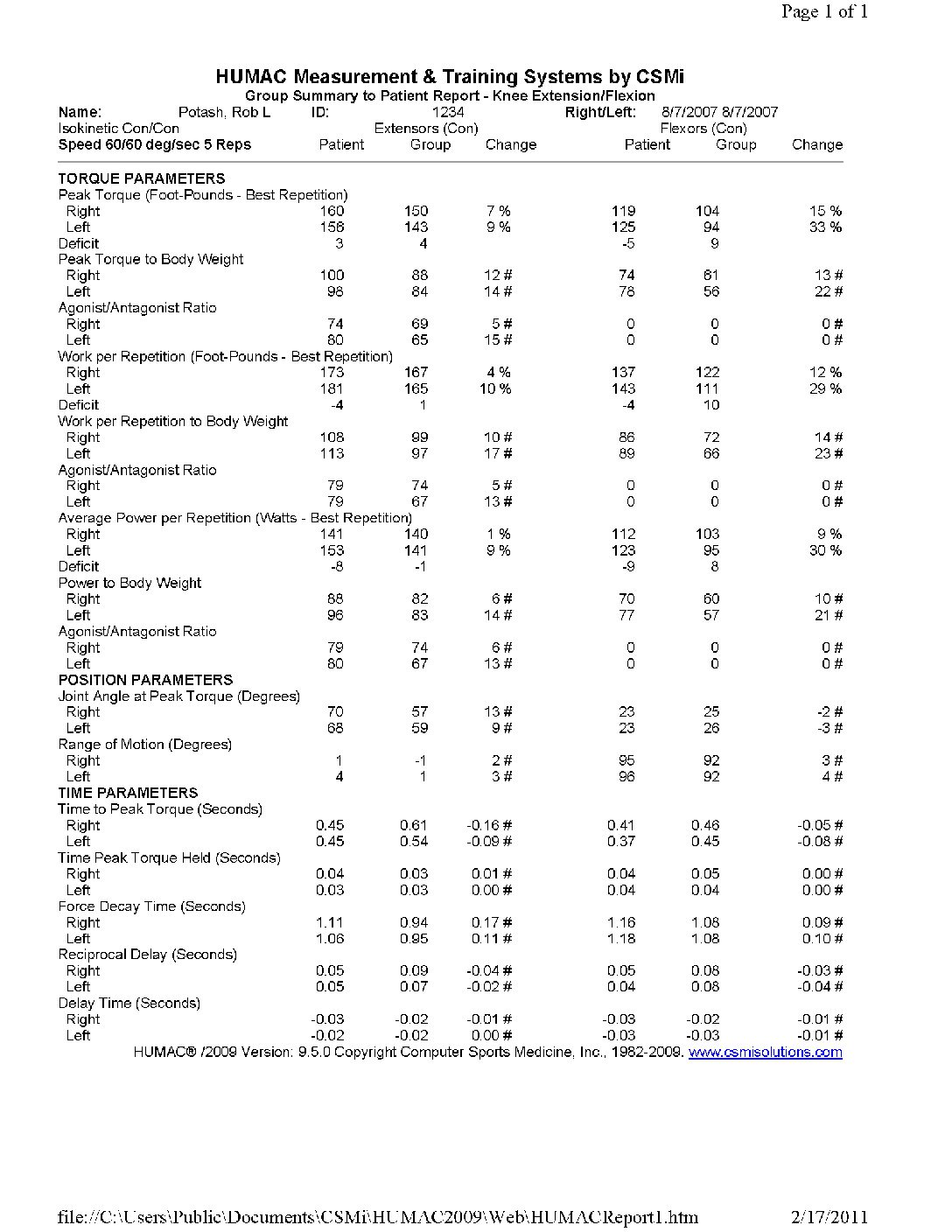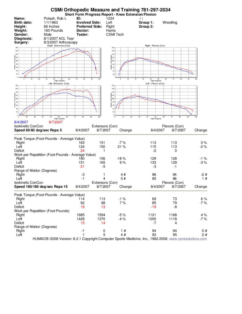 Keep your patients on track with the HUMAC Progress Report. Select an initial test, a follow-up test and HUMAC compares the two. Progress Report includes the name of the facility, test pattern, patient information, graphic, and numeric comparison of test results. This report includes the change in performance for the uninvolved and involved sides.