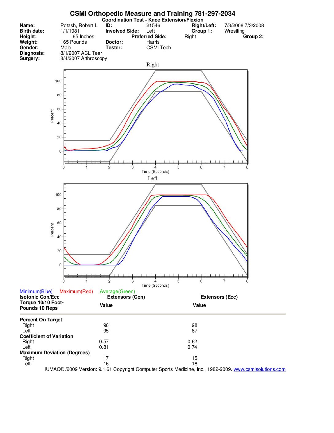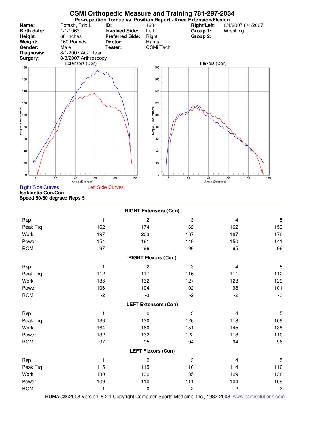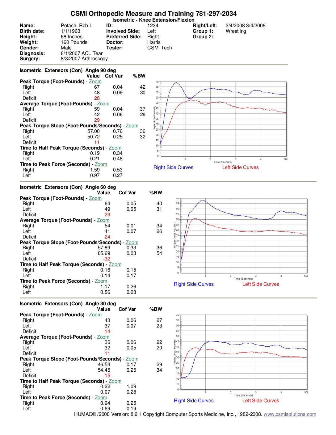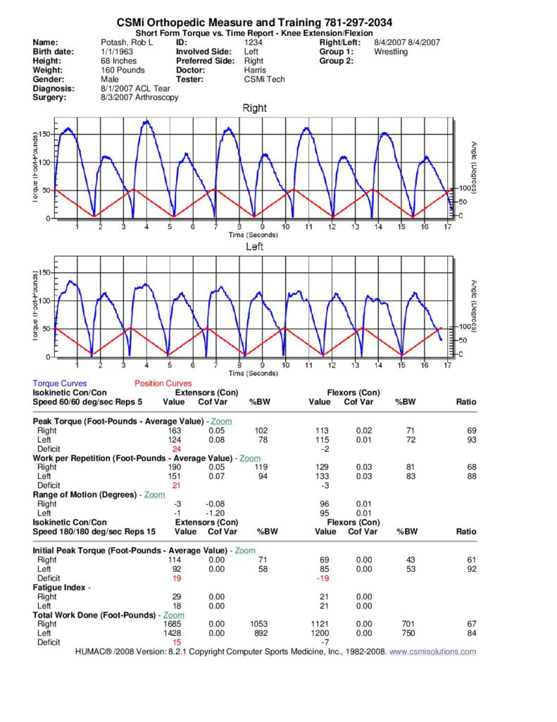 The Short Torque vs. Position Report provides a synopsis of the patient’s performance. From the top down this report includes Report Heading, Test Pattern, Patient Background, Torque vs. Position Curves, Low-Speed Results, followed by High-Speed Results. Included are Co-efficient of Variation, Body Weight, and Agonist/Antagonist Ratios.